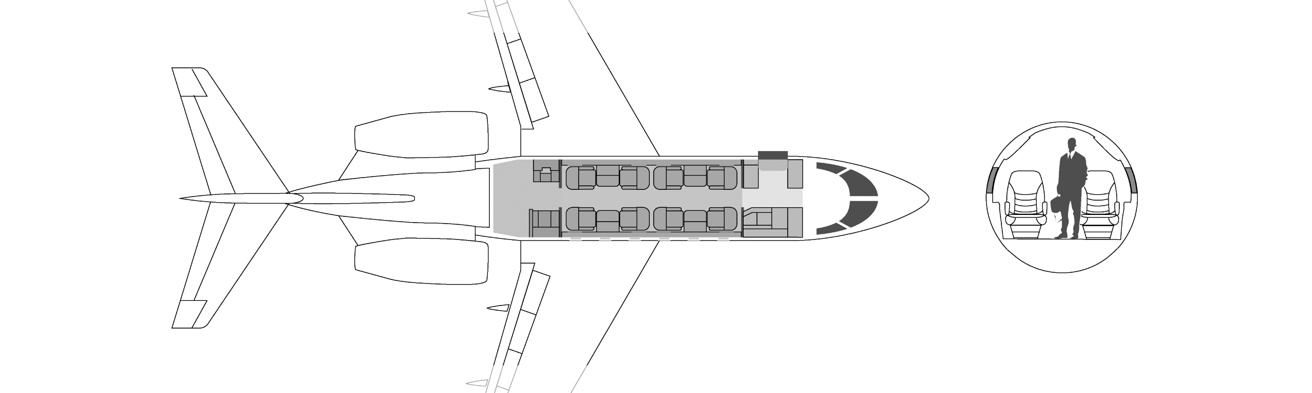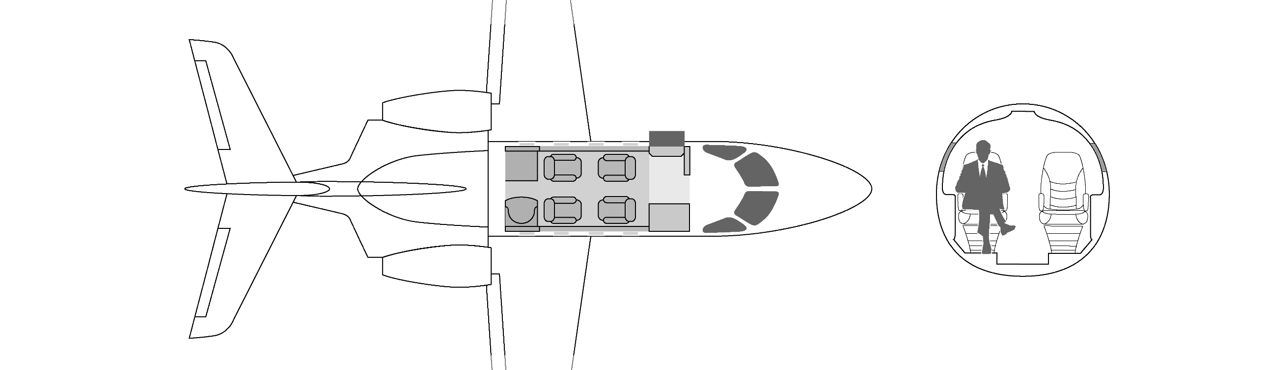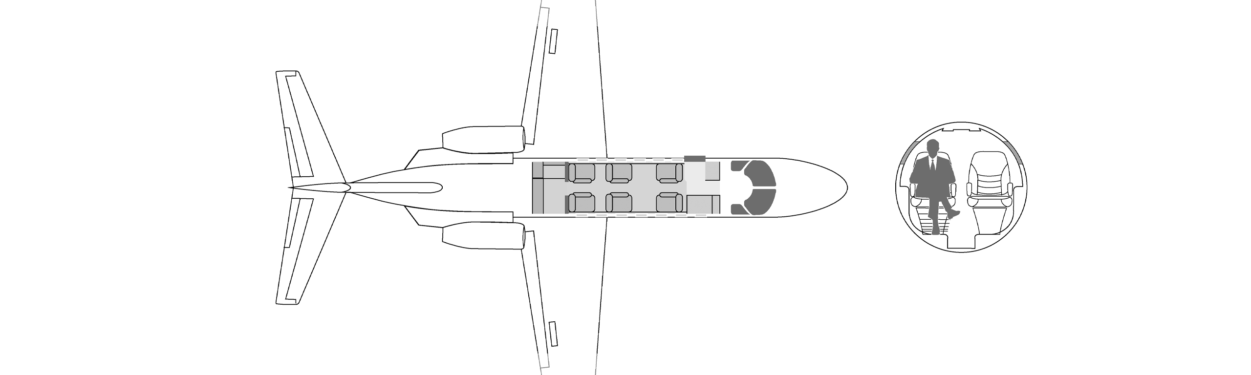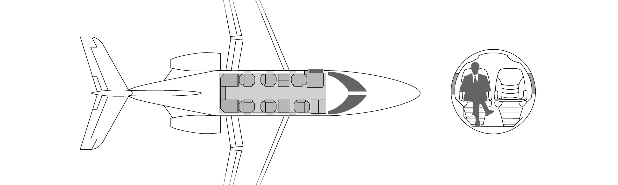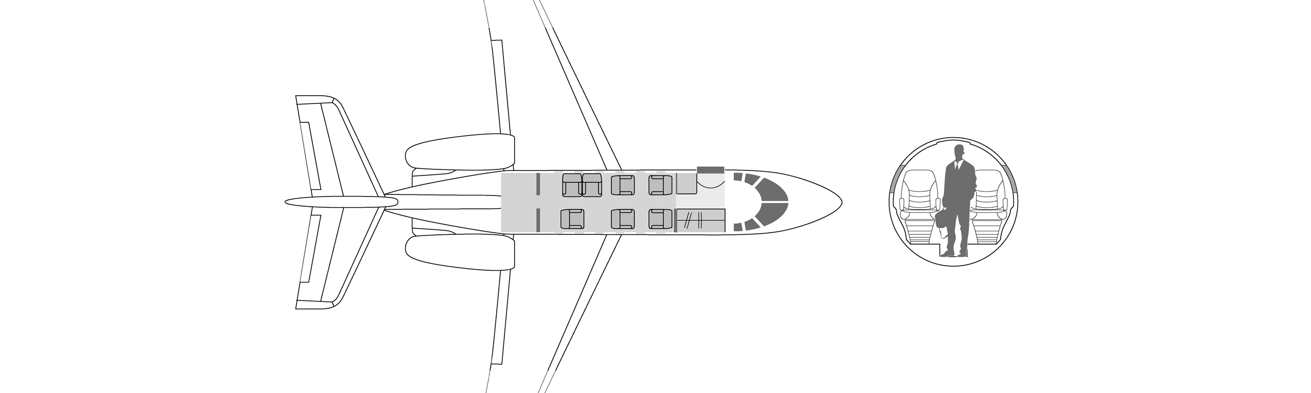 углубление для повышения прохода пассажиров. Самолеты оборудованы небольшими туалетными комнатами, которые делят пространство с гардеробами в задней части самолета, В максимальной комплектации он рассчитан на 8 посадочных мест, но распространенной является компоновка на 6 кресел.