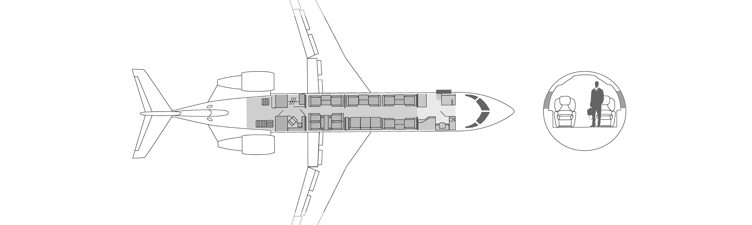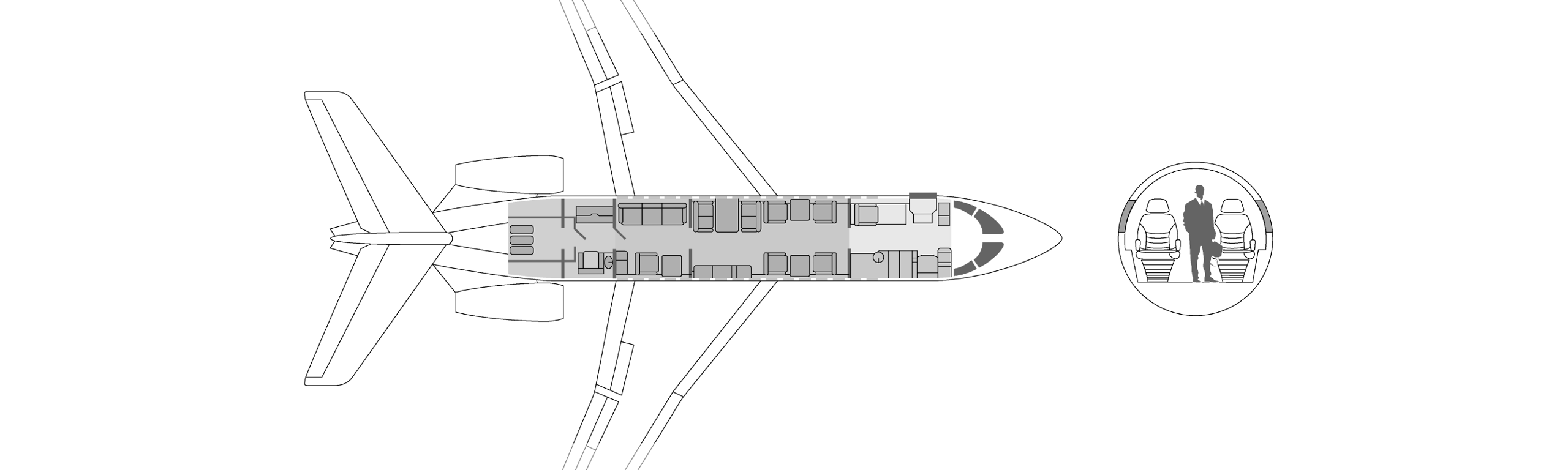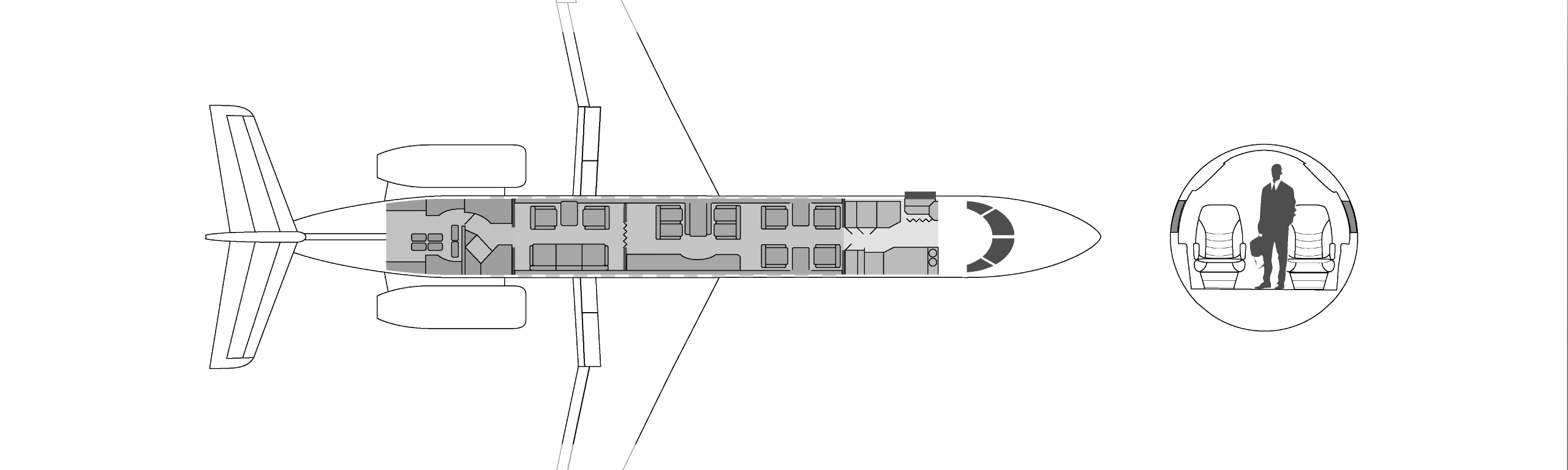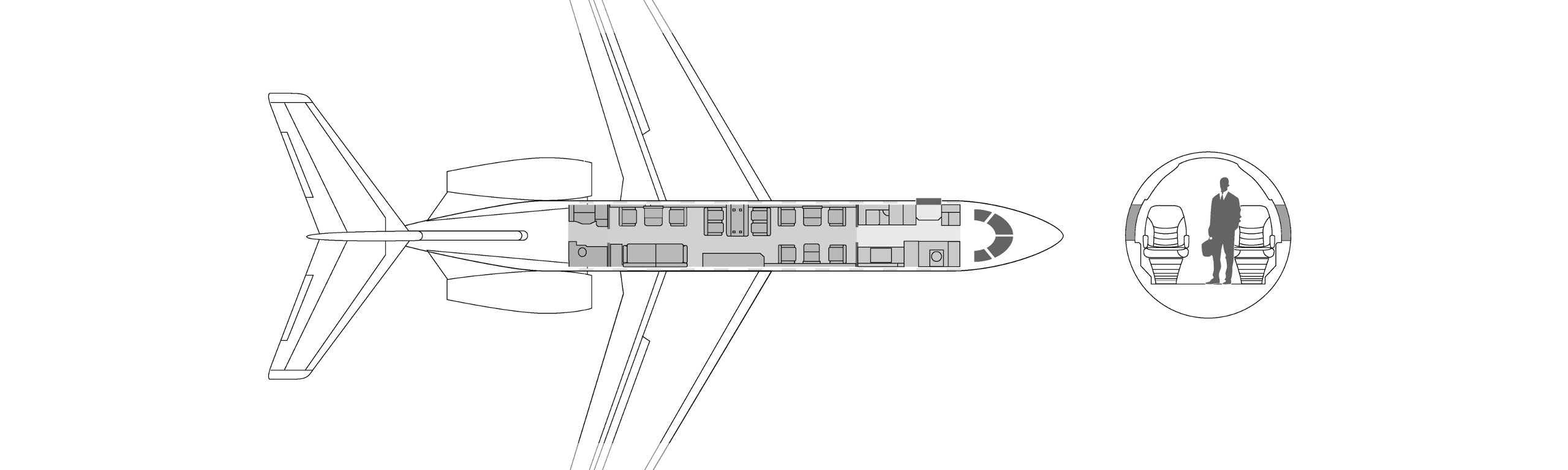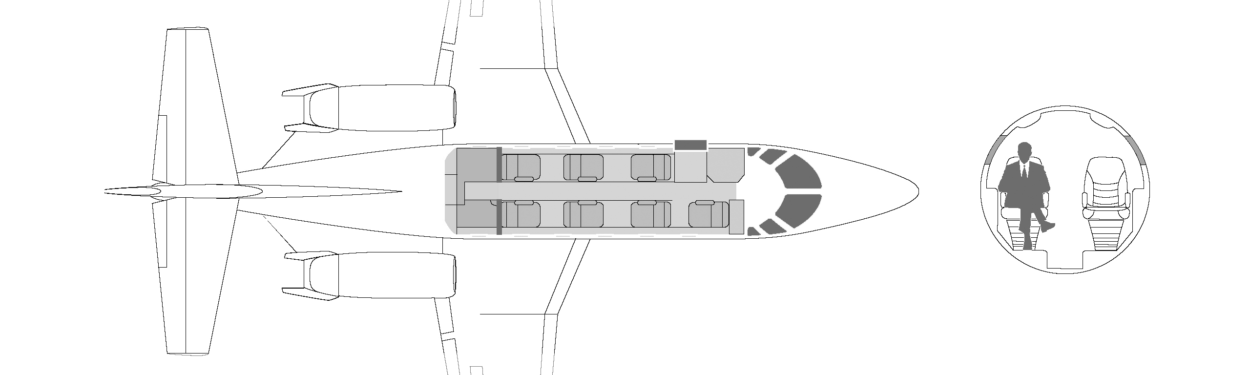 углубление для повышения прохода пассажиров. Самолеты оборудованы небольшими туалетными комнатами, которые делят пространство с гардеробами в задней части самолета, В максимальной комплектации он рассчитан на 8 посадочных мест, но распространенной является компоновка на 6 кресел.